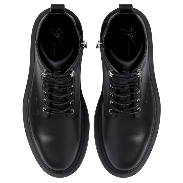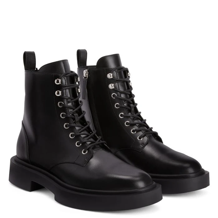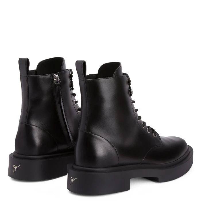 These lace-up biker boots, crafted from black leather with a leather inner lining, feature a silver metal ‘Signature’ detail on the matching oversize rubber sole.