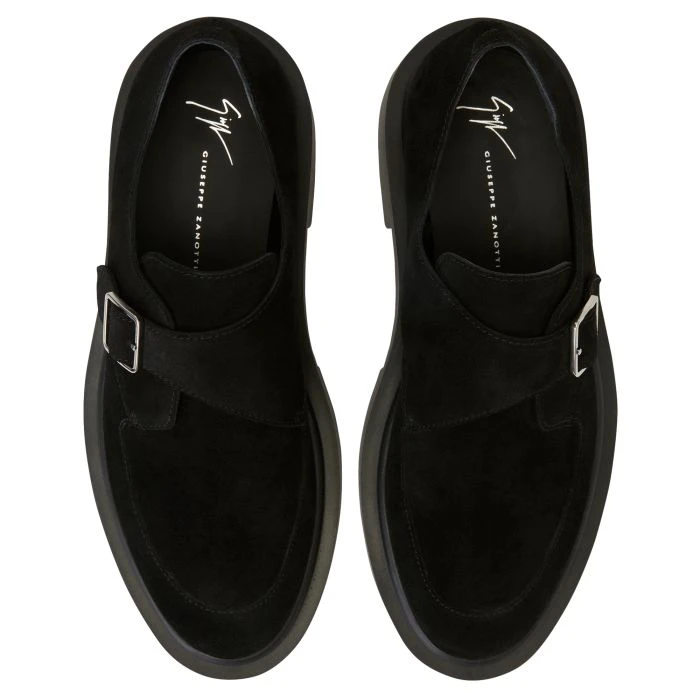 These black velour moccasins feature an upper embellished by a silver metal buckle strap and a one-piece oversize rubber sole with a silver metal ‘Signature’ detail.