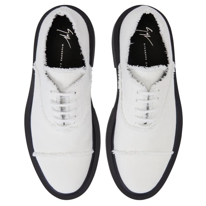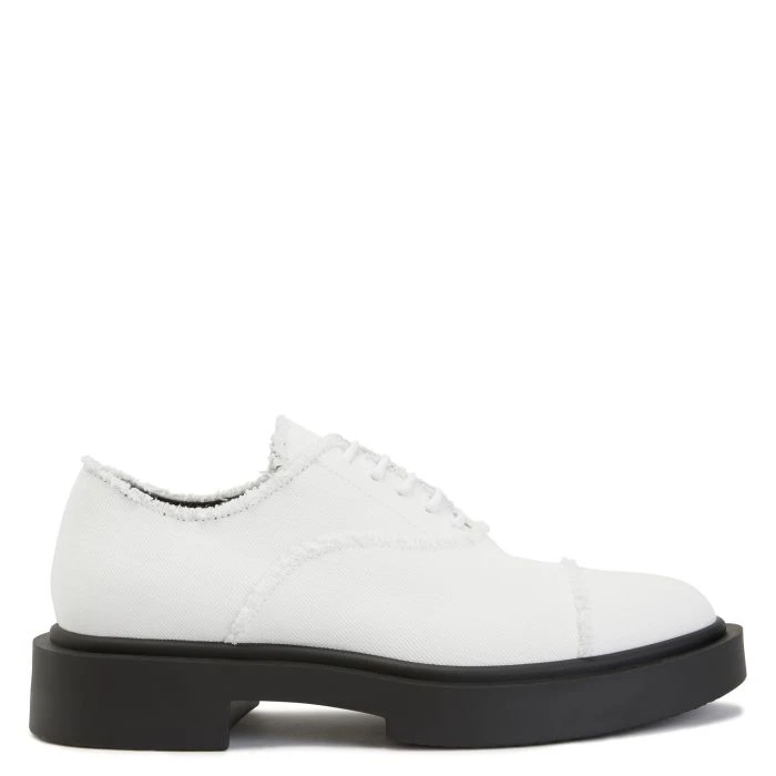 Lace-up Oxford shoes, crafted from white frayed jeans fabric, featuring a leather inner lining and an oversized black rubber sole with a silver ‘Signature’ detail on the back of the heel.