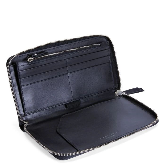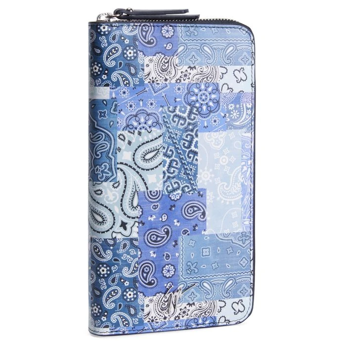 Indigo leather continental wallet with bandana print, leather and fabric inner lining, metal zipper on three sides, inner pocket and card slots. The iconic nickel metal ‘Signature’ detail completes the accessory.