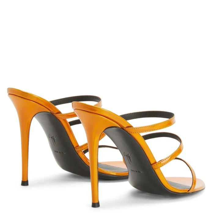Mules crafted from orange iridescent synthetic fabric with a mirror effect, featuring matching covered stiletto heels, black leather soles embellished with golden details and three thin straps.