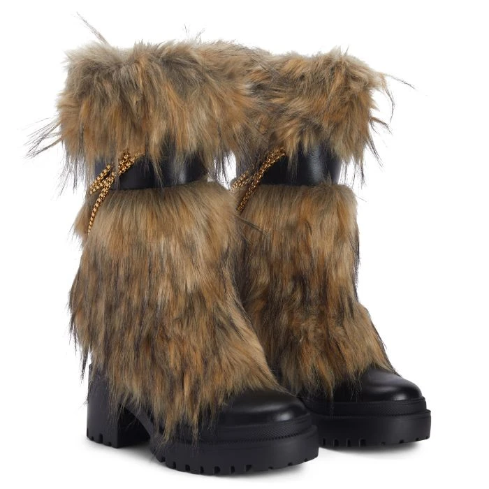 These boots are crafted from beige faux fur and feature black leather details, a golden metal chain accessory applied to the shaft and black one-piece rubber sole with chunky heel.