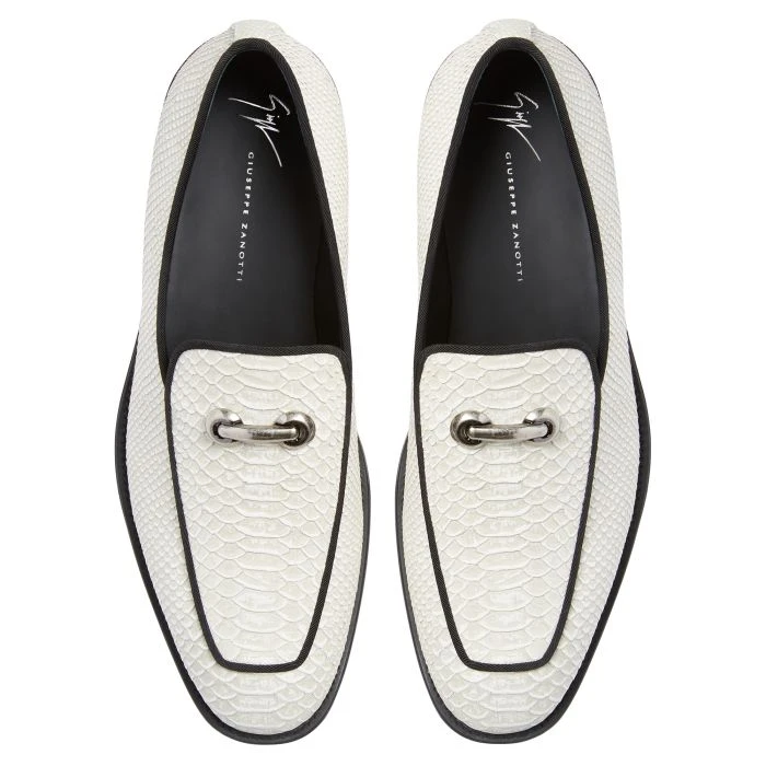 These loafers, crafted from off-white leather with a python print, feature black synthetic fabric trims, a rubber sole and a metal buckle accessory with an antique silver finish applied to the upper.