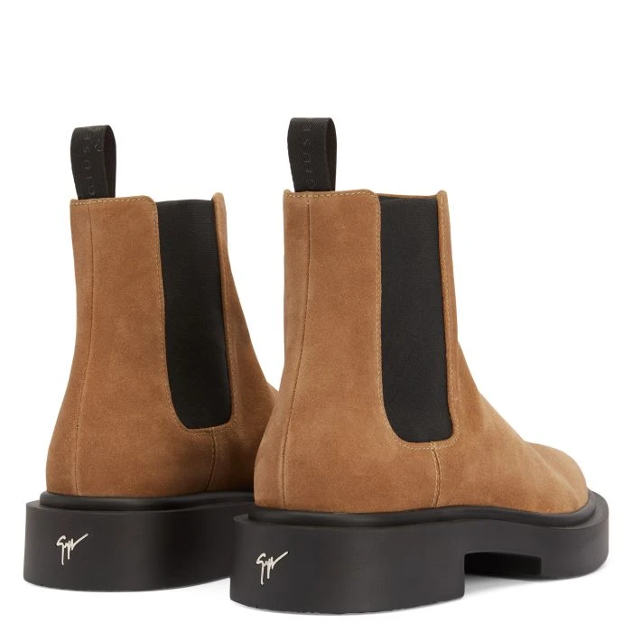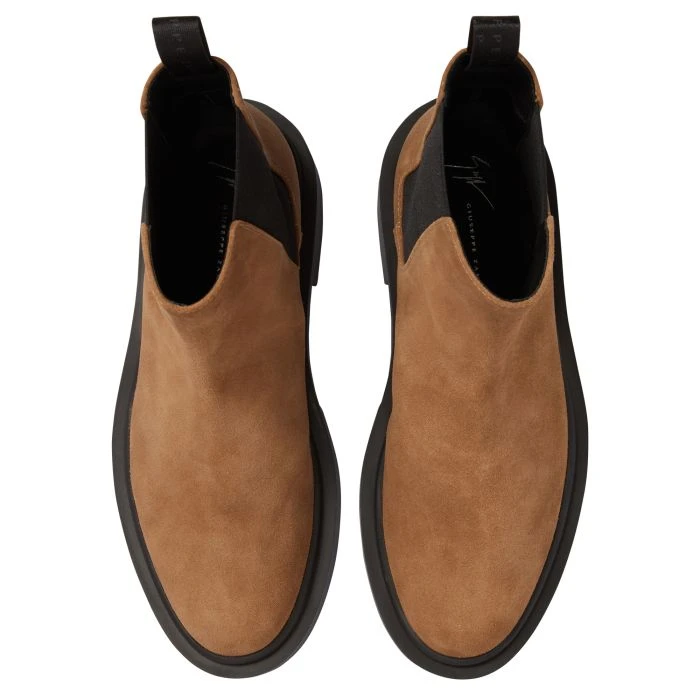 These Chelsea ankle boots, crafted from light-brown velour with a rubber sole and leather inner lining, feature black elastic side inserts and a black pull tab with logo placed on the back of the shaft to ease the fit.