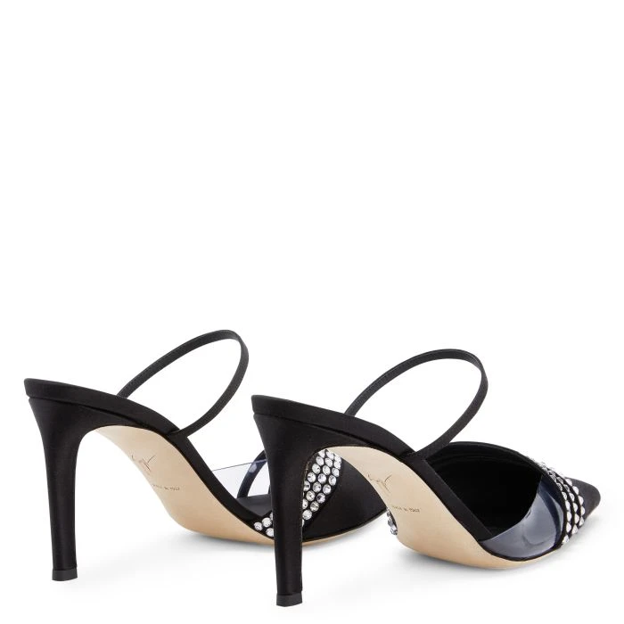 These pointed-toe black satin mules, featuring a toe box with a clear PVC insert and a thin strap on the instep, are embellished with embroidered rows of crystal-coloured rhinestones and a matching covered heel.