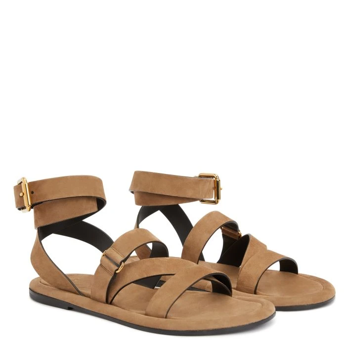 These sandals are crafted from light-brown suede and feature crossed straps, an adjustable ankle strap with buckle, a golden metal ‘Signature’ detail and a leather sole.