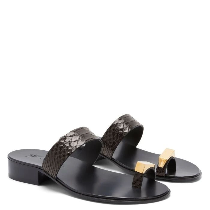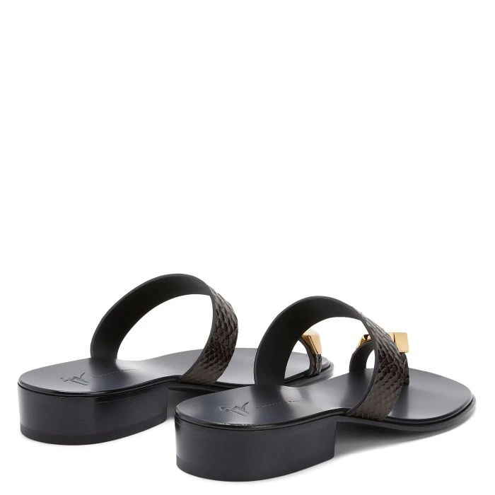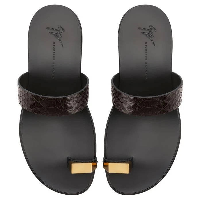 Flat thong sandals crafted from dark brown crocodile-print leather featuring a golden metal accessory applied to the toe ring strap and a leather sole.