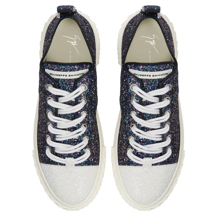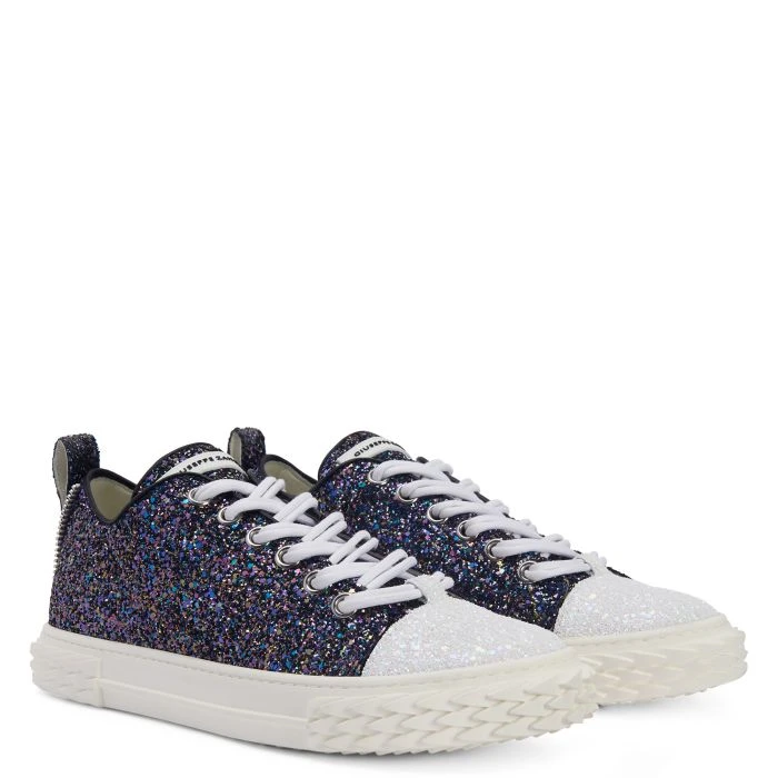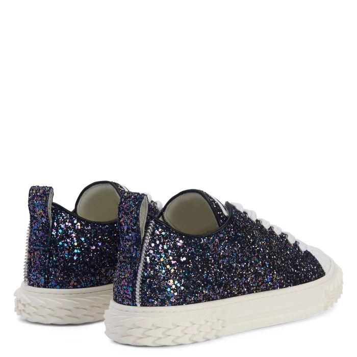 These low-top sneakers, crafted from black synthetic fabric with glitter and white toecap, feature a white rubberised ‘Label Signature’ on the tongue and white cotton laces; a silver metal zipper detail on the heel and the eye-catching ‘Blabber’ sole in 3D-effect, off-white rubber give the design a perfect finish.