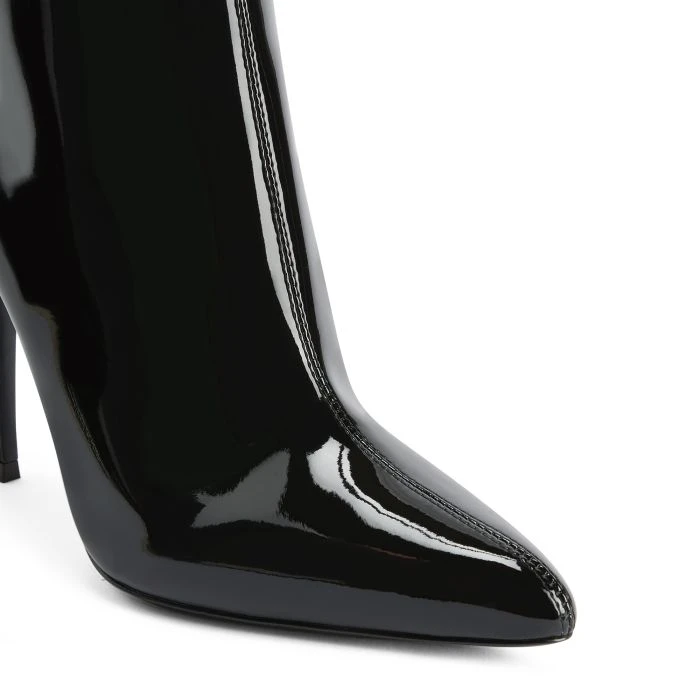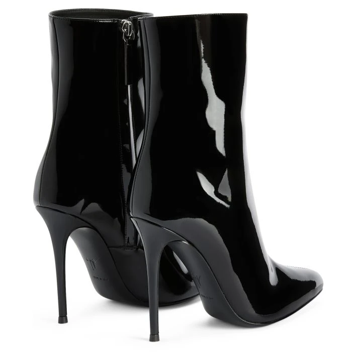 These pointed-toe ankle boots are crafted from patent-effect black synthetic fabric, feature matching covered stiletto heels, a black zipper on the inner side and a black leather sole.