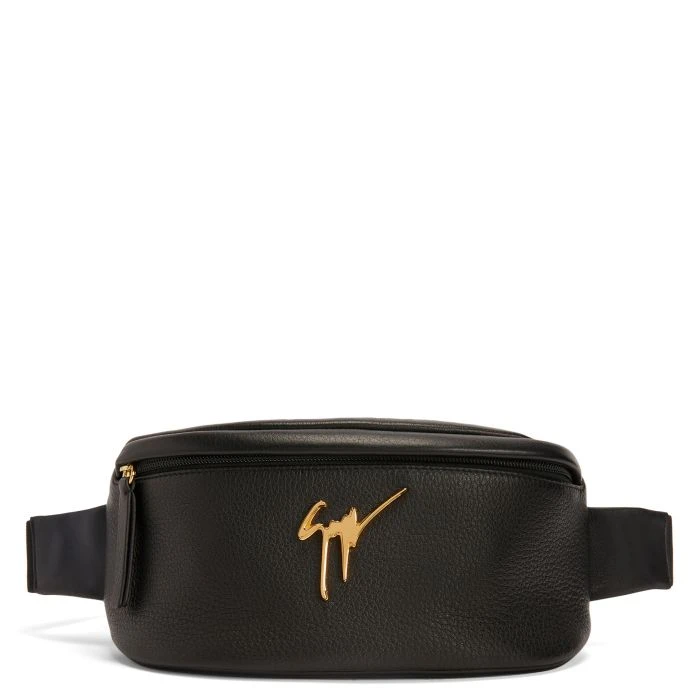 Black leather belt bag, featuring a zipper fastening with matching puller and adjustable shoulder strap. The iconic golden metal ‘Signature’ detail completes the accessory.