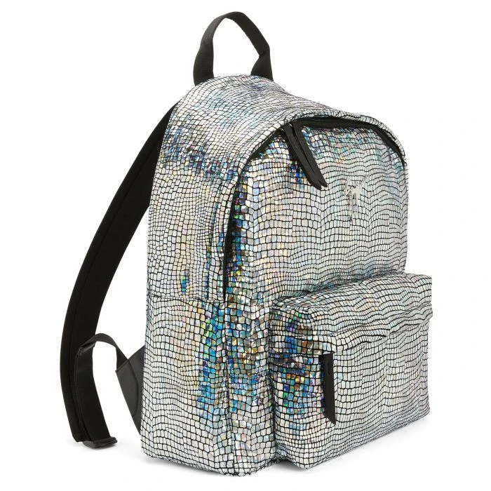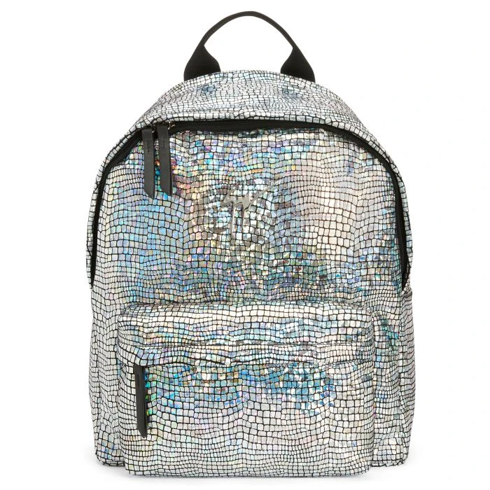 Suede backpack with a grey, iridescent and laminated crocodile print, featuring a maxi front pocket, inner zipper pocket, two-way zip fastening and adjustable padded shoulder straps in fabric with leather inserts. The iconic nickel metal ‘Signature’ detail and the black leather pullers complete the accessory.