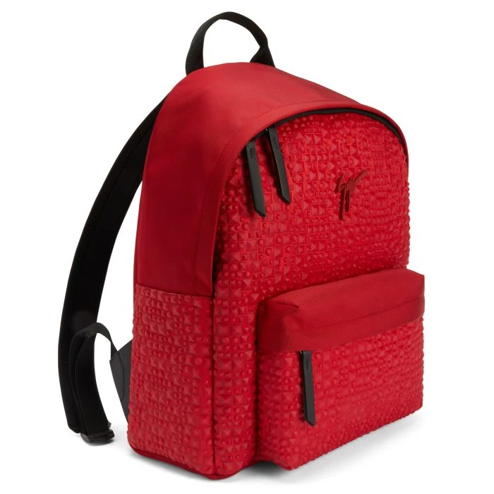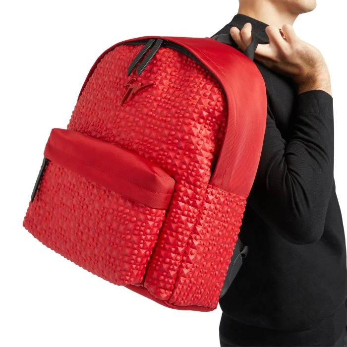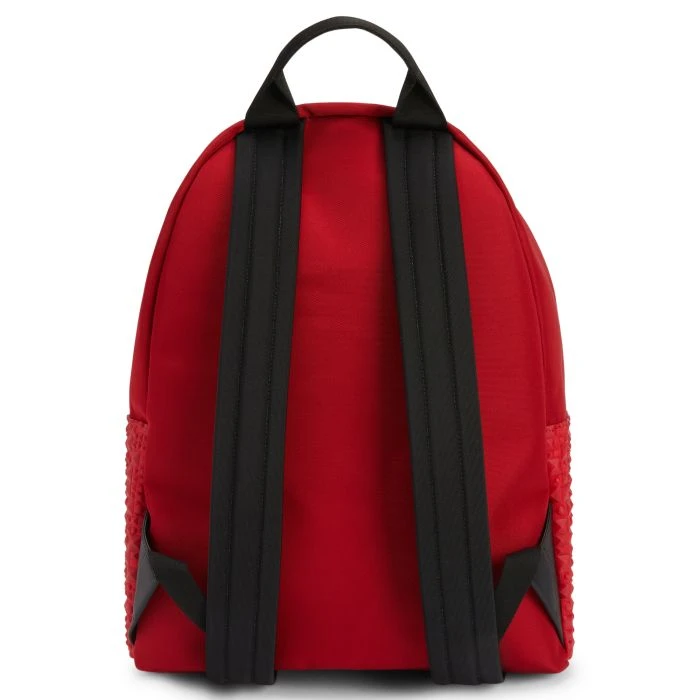 Red synthetic fabric backpack with a 3D diamond-shaped print, maxi front pocket, inner zipper pocket, two-way zip fastening and adjustable padded shoulder straps in fabric with leather inserts. The iconic black metal ‘Signature’ detail and matching leather pullers complete the accessory.