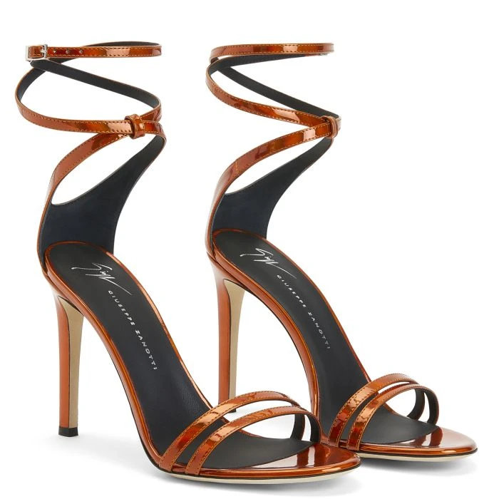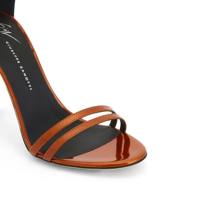 These sandals are crafted from orange laminated leather and feature a leather sole, and are characterised by a matching covered heel, a double front strap and a thin, crossed ankle strap with a small metal buckle to adjust the fastening.