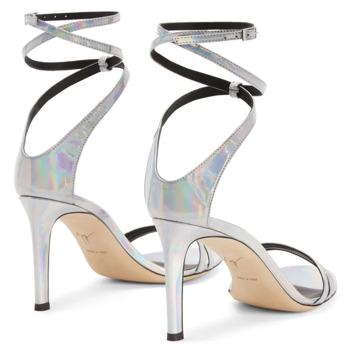 These sandals are crafted from silver laminated leather and feature a leather sole, and are characterised by a matching covered heel, a double front strap and a thin, crossed ankle strap with a small metal buckle to adjust the fastening.