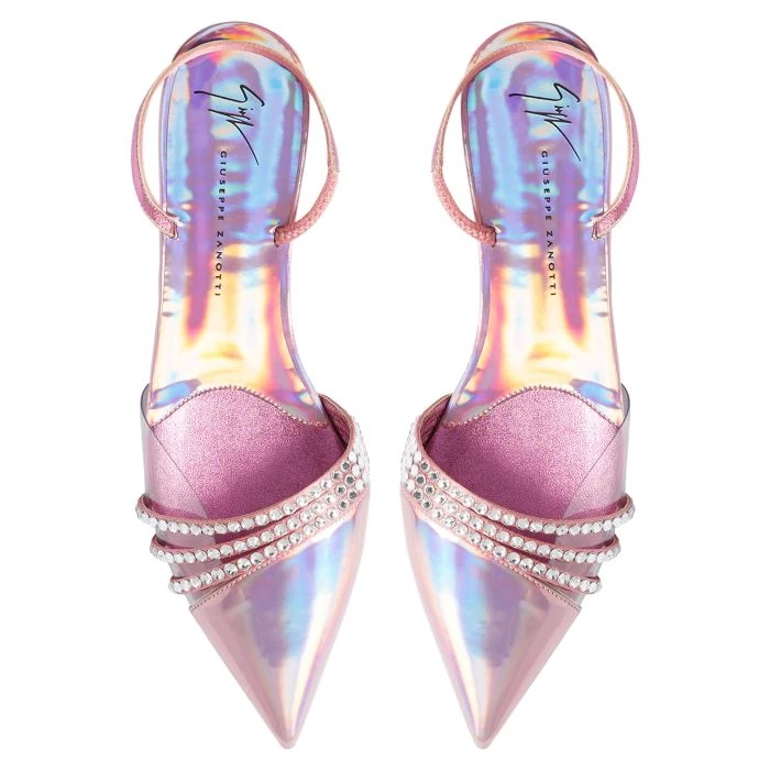 These pointed-toe slingback flat sandals, crafted from pink laminated synthetic fabric and synthetic satin, feature a toe box with a clear PVC insert and a thin strap on the instep and are embellished with embroidered rows of crystal-coloured rhinestones.