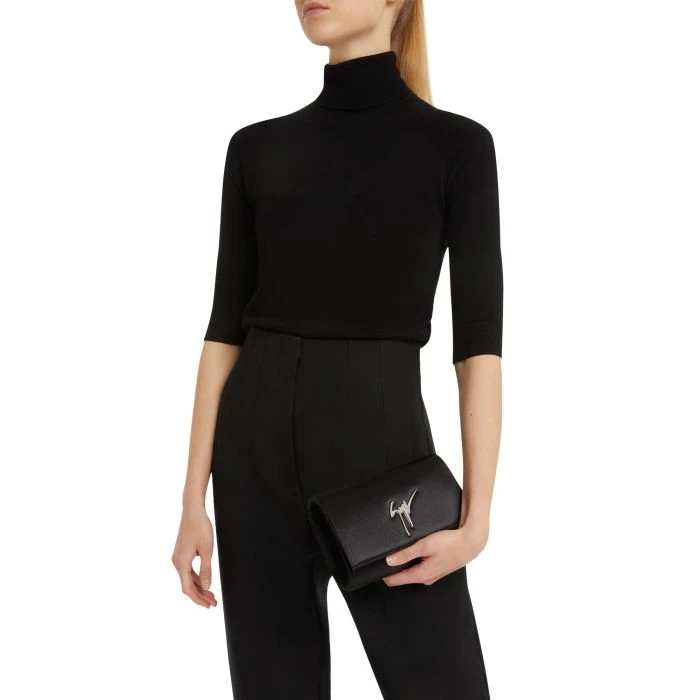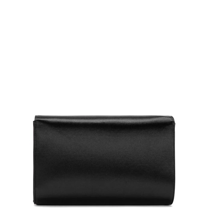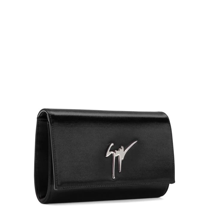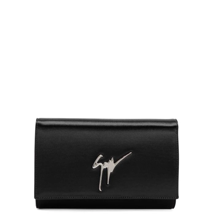 Clutch crafted from black stretch satin-effect synthetic fabric with magnetic fastening, featuring the iconic silver metal ‘Signature’ detail on the flap and a silver metal chain shoulder strap; the leather and fabric inner lining include a zipped pocket and six card slots.