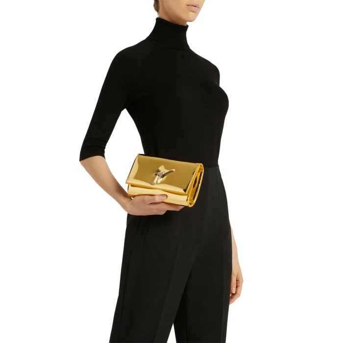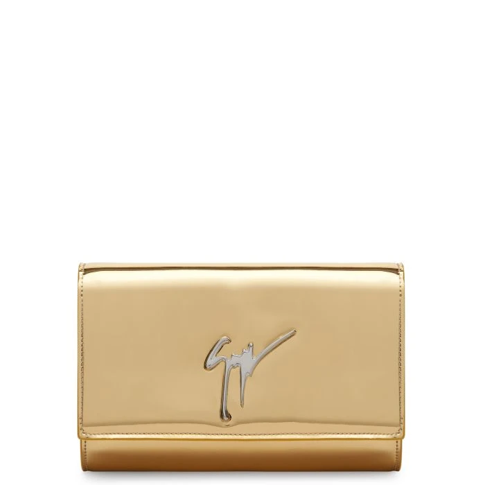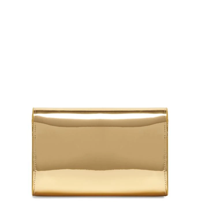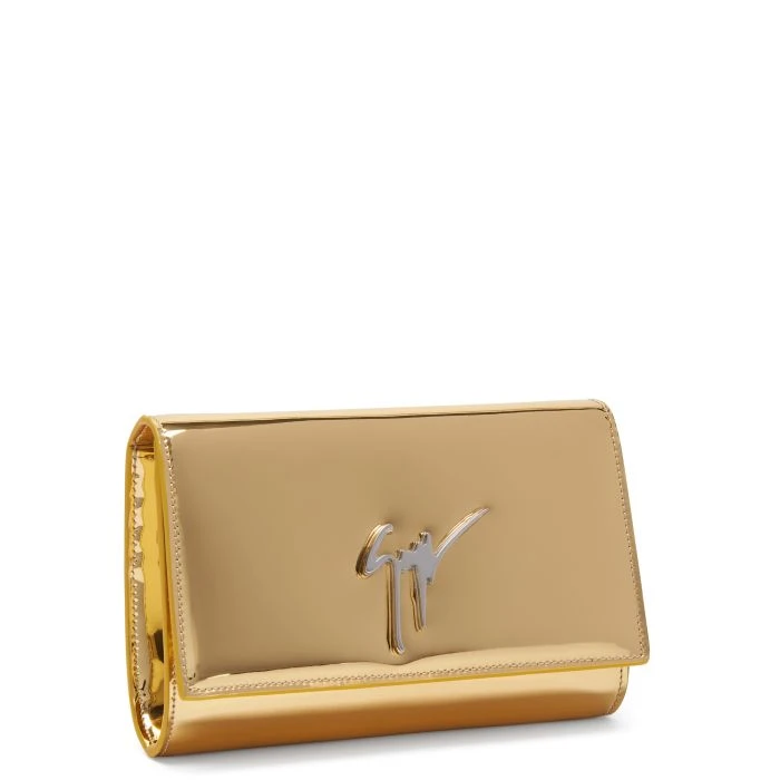 Clutch crafted from golden mirror-effect synthetic fabric with magnetic fastening, featuring the iconic ‘Signature’ detail on the flap and a metal chain shoulder strap; the leather and fabric inner lining include a zipped pocket and six card slots.