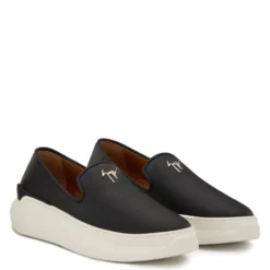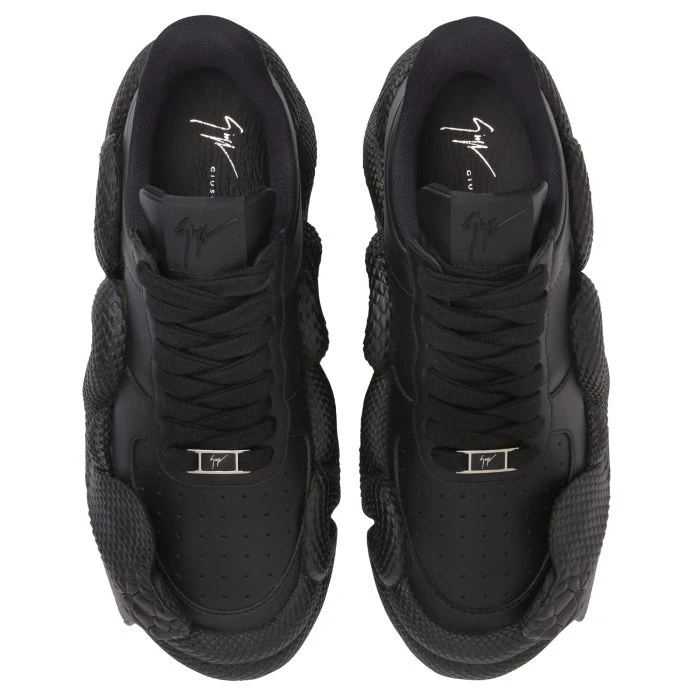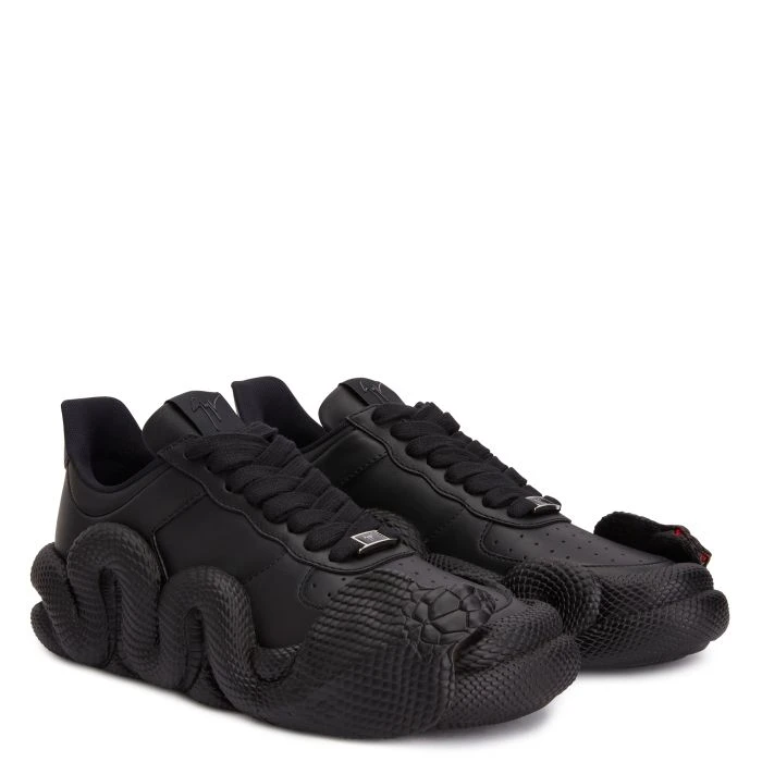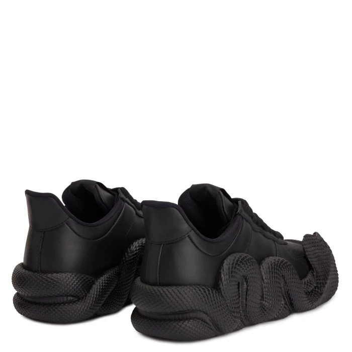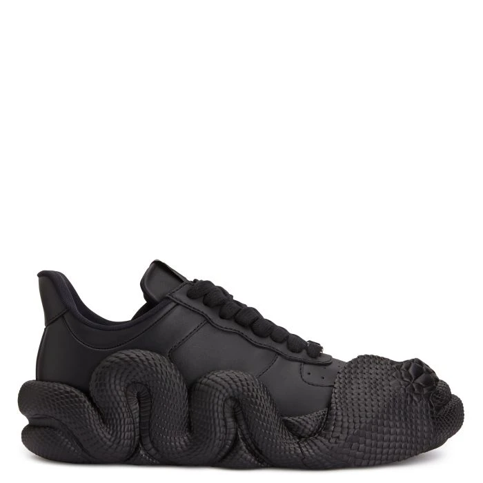 Black leather ”Cobras” trainers with tone-on-tone cotton laces and a small, logo-bearing silver and black metal buckle. This shoe features the iconic black fabric Signature detail on the tongue and the new, bold black rubber ”Cobras” sole completes the bold design of this unique shoe.