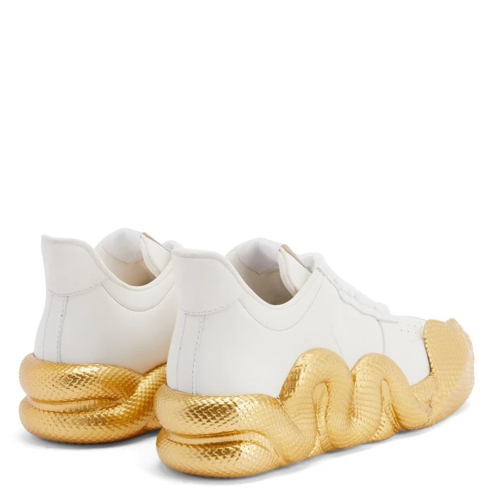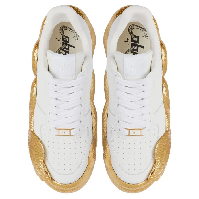 Low-top ‘Cobras’ sneakers crafted from white leather with matching cotton laces embellished by a white-and-gold metal deubré; an iconic black fabric ‘Signature’ detail decorates the tongue and the new, bold golden rubber ‘Cobras’ sole completes the edgy design of this unique shoe.