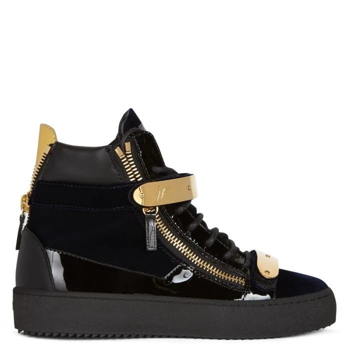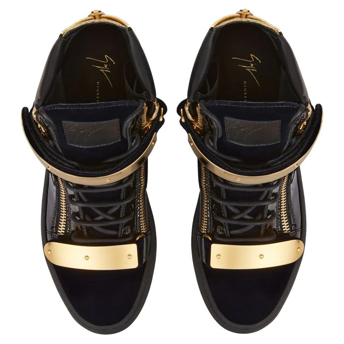 Here, an iconic and utterly unmistakable Zanotti trainer has been recreated with a navy-blue velvet upper and black patent inserts. Complete with two golden metal straps, zip fastening at the sides and a black rubber sole.
