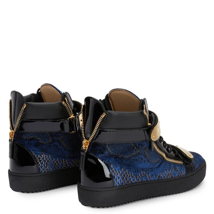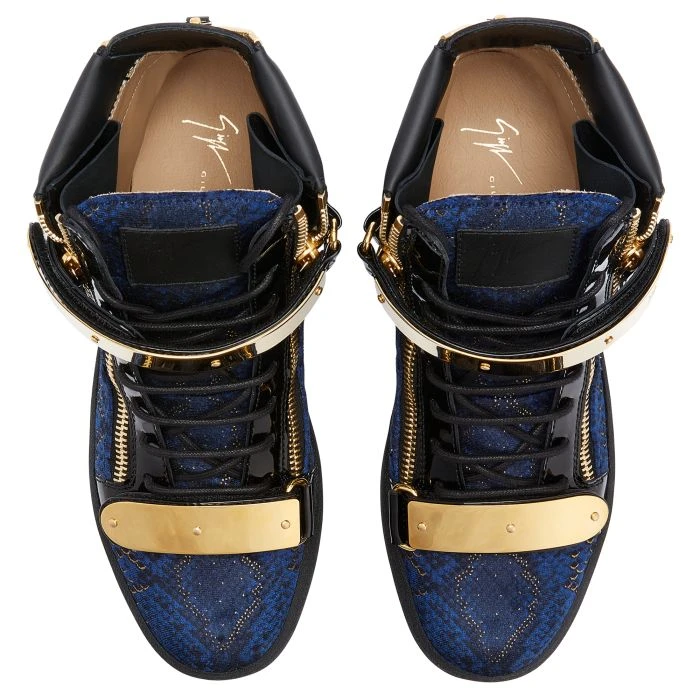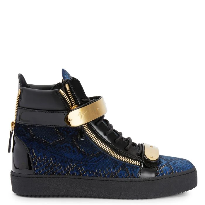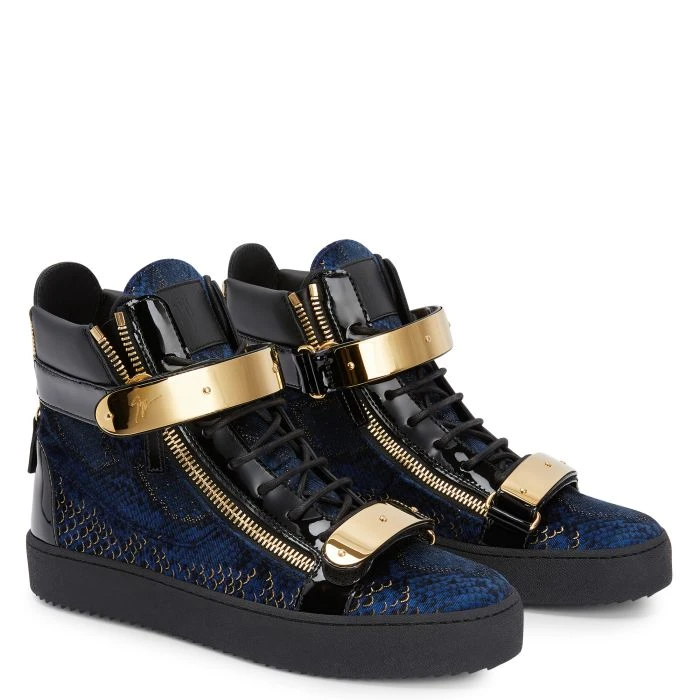 High-top sneakers crafted from black patent leather, featuring golden side zipper fastening, two golden metal Velcro straps with logo and a ‘Signature’ detail on the tongue; a black rubber sole gives the design a perfect finish.