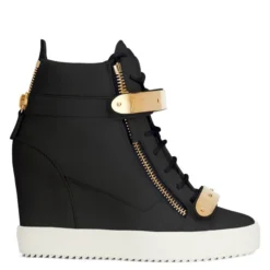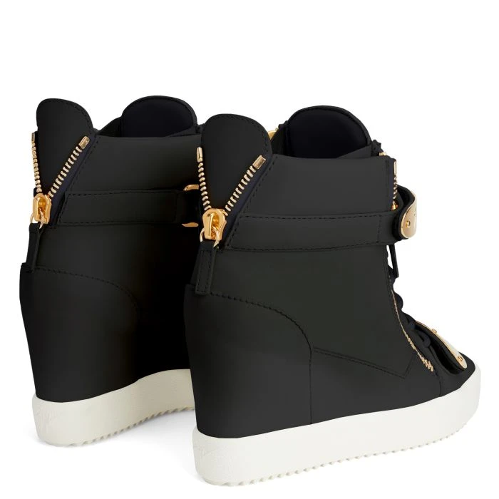 Black leather wedge sneakers with matching cotton laces, featuring side zipper fastenings and two golden metal Velcro straps with logo; the contrasting white rubber sole with an inner wedge completes this sporty-chic model.