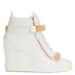 This high-top wedge sneaker features a white leather upper featuring a golden metal ‘Signature’ detail and matching straps with logo. Golden zipper details on the sides and back, a metal ‘Signature’ detail and a white rubber sole give this shoes design the perfect finish.