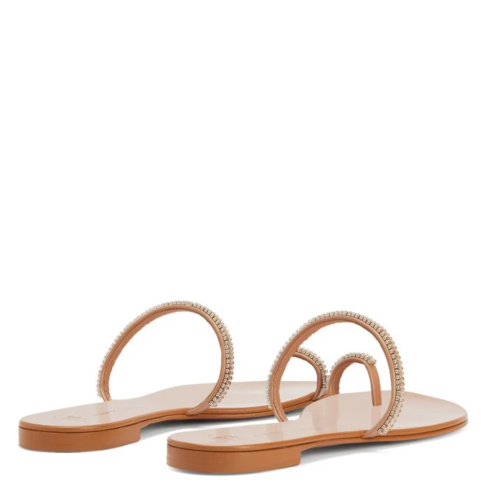 Flat thong sandals with leather soles, crafted from flesh-coloured patent-effect synthetic fabric and featuring thin straps embellished with silver metal chain hardware with champagne-coloured rhinestones.