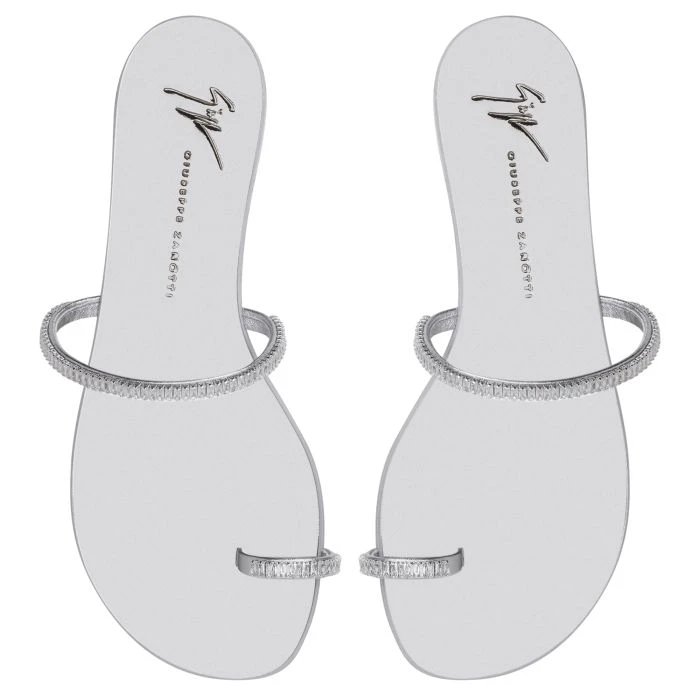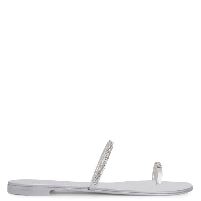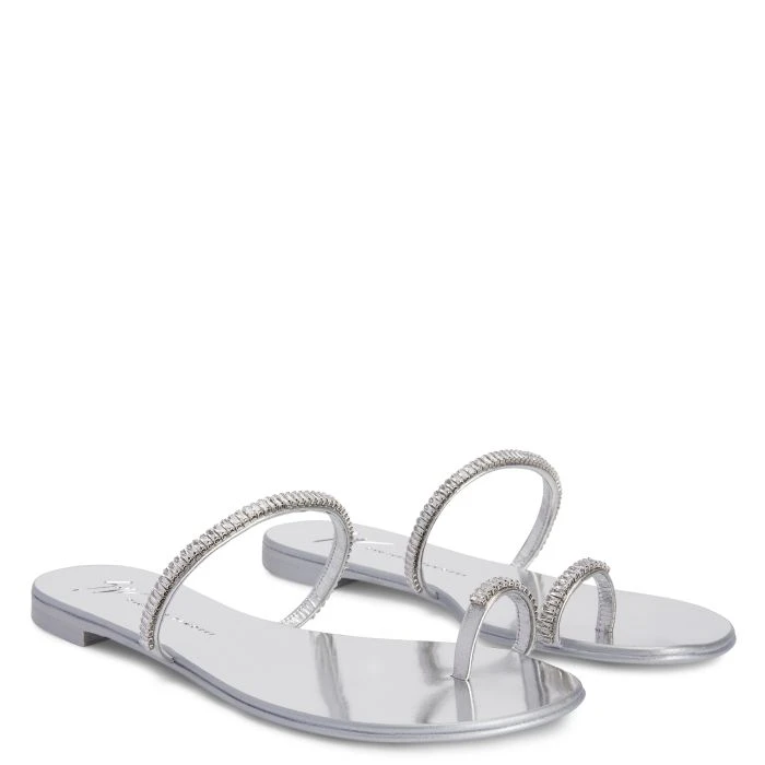 Made from silver laminated leather, this flat thong sandal features thin straps decorated with silver metal chains and applied crystal rhinestones and is characterised by a glossy tone-on-tone leather sole with logo.