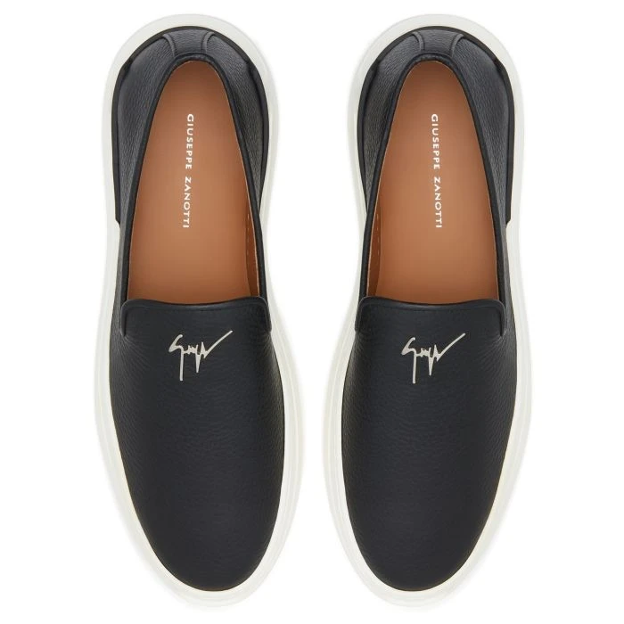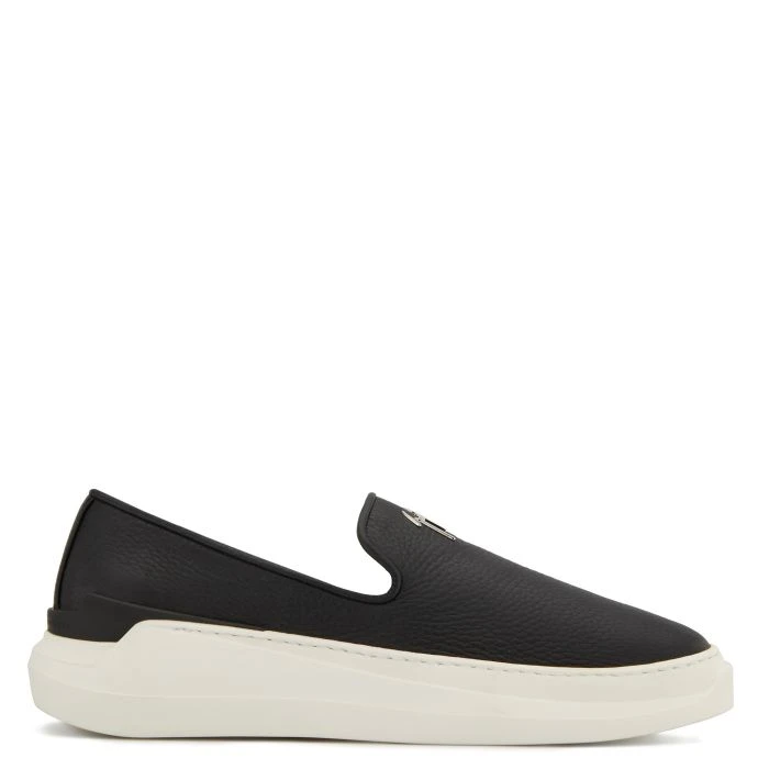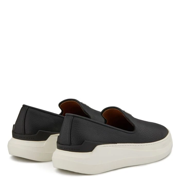 These black leather slip-on shoes feature an applied metal Signature logo on the upper. They are set on a white rubber sole with logo.