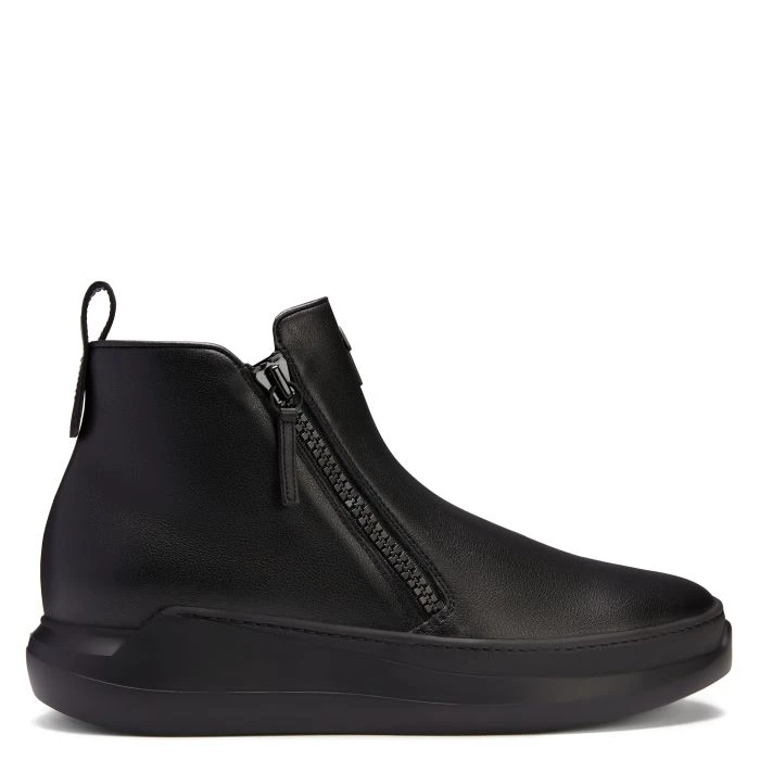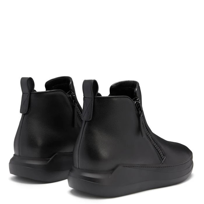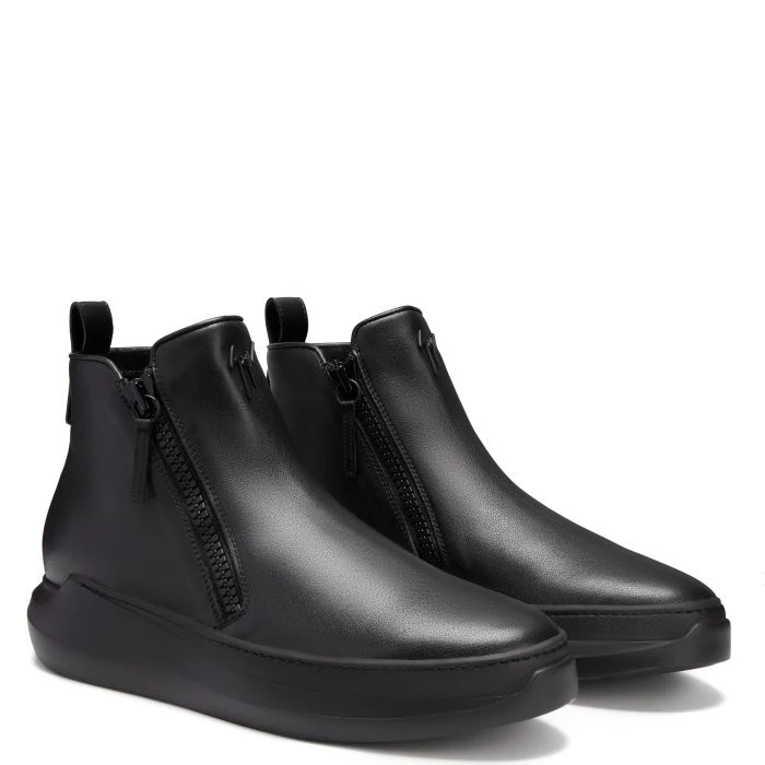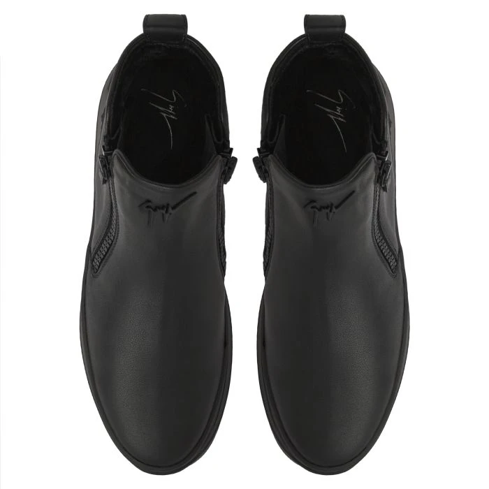 Black leather ankle boots with black rubber-topped Signature, zip fastening at the side, matching leather inner lining and logo-bearing rubber sole.