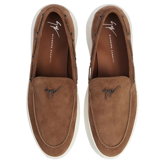 These slip-ons, crafted from light-brown velour with leather inner lining, feature a moccasin construction upper and a contrasting white rubber sole. The metal ‘Signature’ detail with a silver antique finish on the vamp and a light-brown lace wrapped around the quarter through matching eyelets give the design a perfect finish.