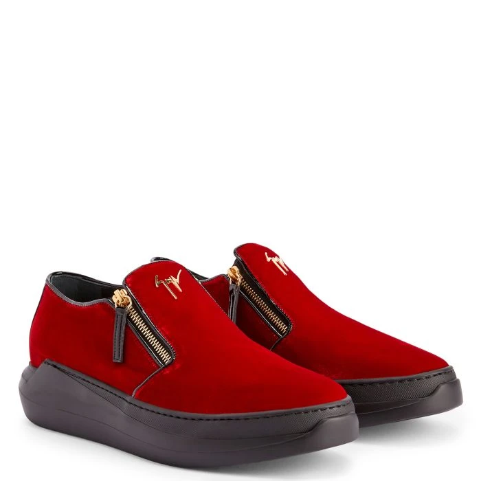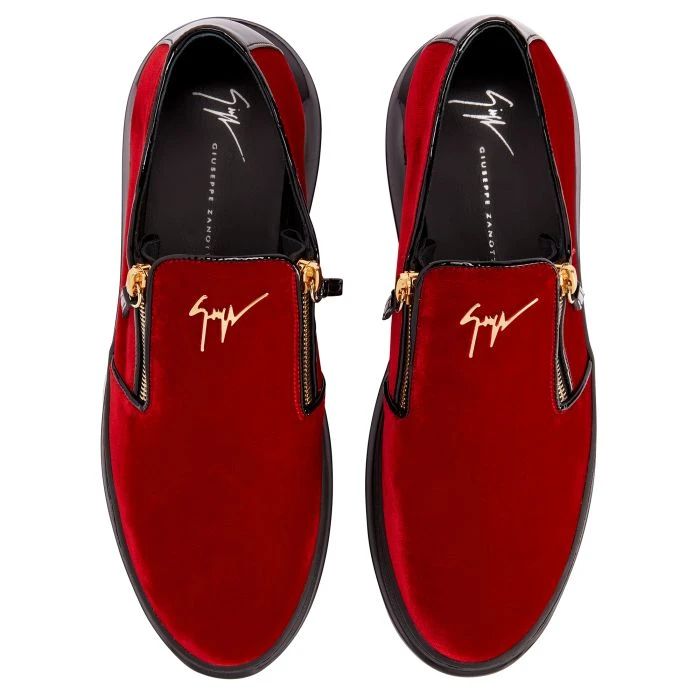 Slip-ons crafted from red velvet featuring patent-effect black synthetic fabric details, matching rubber sole and inner leather lining. The design features a leather inner lining and is complete with golden metal side zippers and a golden metal ‘Signature’ detail on the upper.
