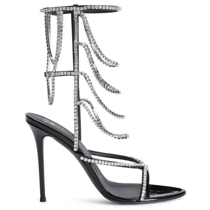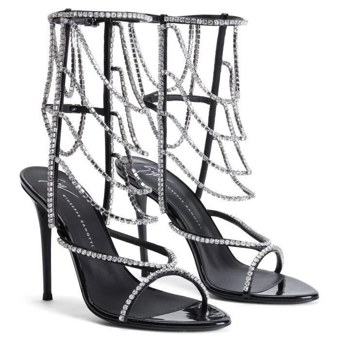 These open-toe sandals made of black synthetic fabric with a patent effect, feature adjustable straps with silver metal buckles, matching covered heels and leather soles, and are embellished with a stunning silver metal chains accessory with crystal-coloured rhinestones.