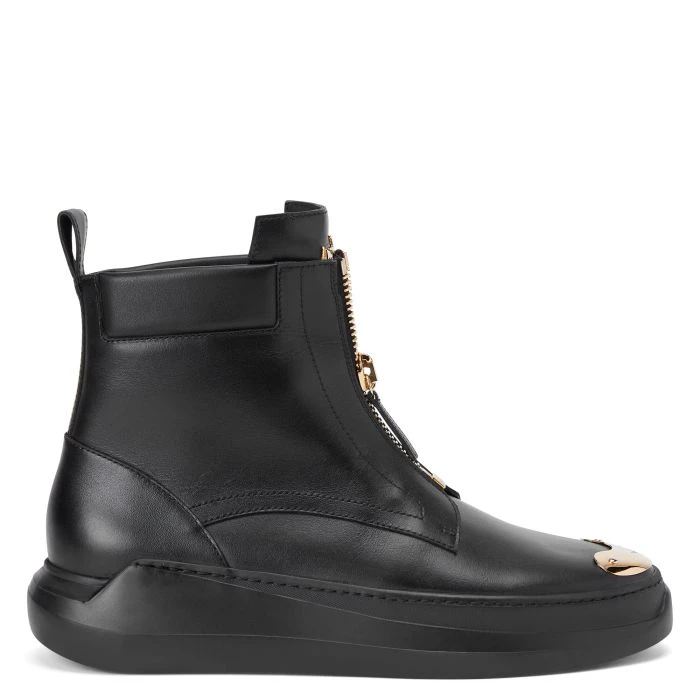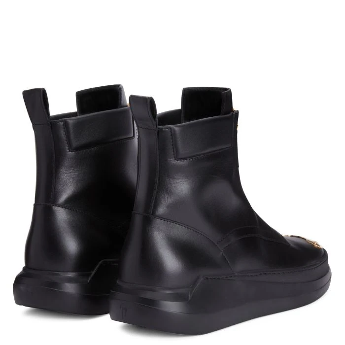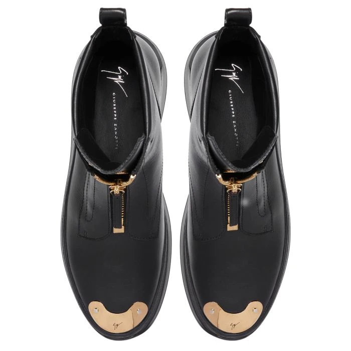 These slip-on ankle boots are crafted from black leather with a golden metal toecap and feature a pull tab to ease the fit, a golden metal ‘Signature’ detail on the tongue and a black rubber sole with logo.