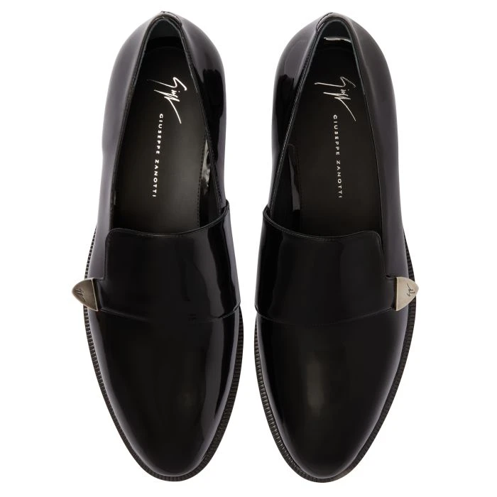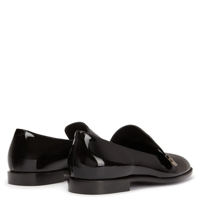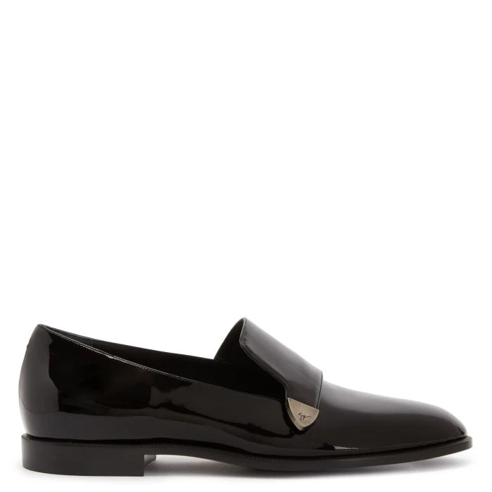 These loafers, crafted from black patent-effect synthetic fabric, feature a metal logo detail with a silver antique finish on the upper and leather inner lining and sole.