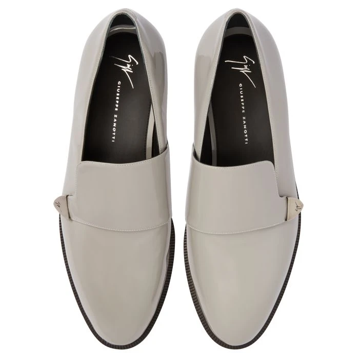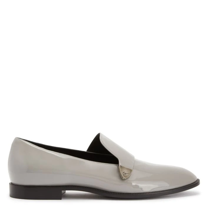 These loafers, crafted from grey patent-effect synthetic fabric, feature a metal logo detail with a silver antique finish on the upper and leather inner lining and sole.