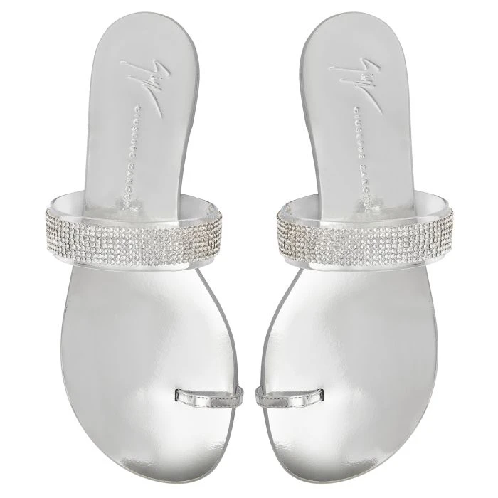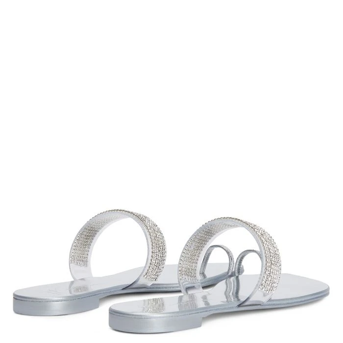 Flat thong sandals crafted from clear PVC and silver mirror-effect synthetic fabric, featuring a ring strap embellished with a silver metal accessory and crystal rhinestones.