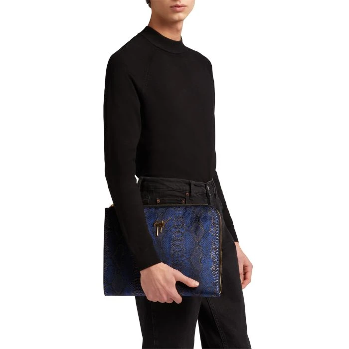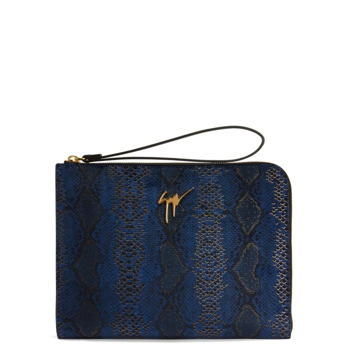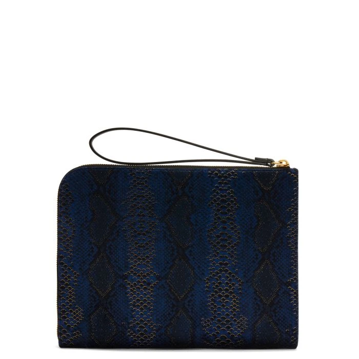 This pouch is crafted from blue reptile-print synthetic velvet with fabric inner lining and features a golden metal zipper fastening on two sides and a matching wrist puller, and is embellished by the iconic golden metal ‘Signature’ detail.
