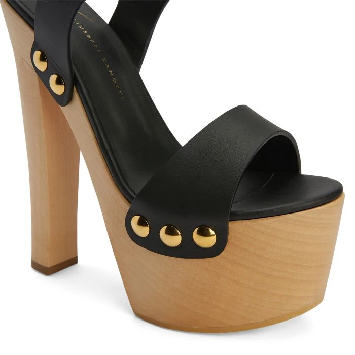 Sandals crafted from black leather, with natural wooden clogs featuring golden metal hardware, adjustable ankle straps with golden metal buckles and matching natural rubber soles.