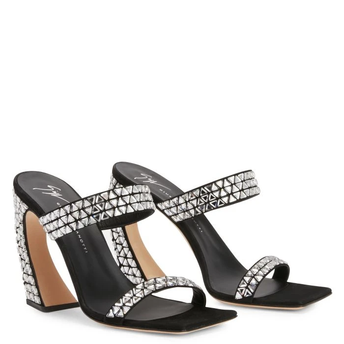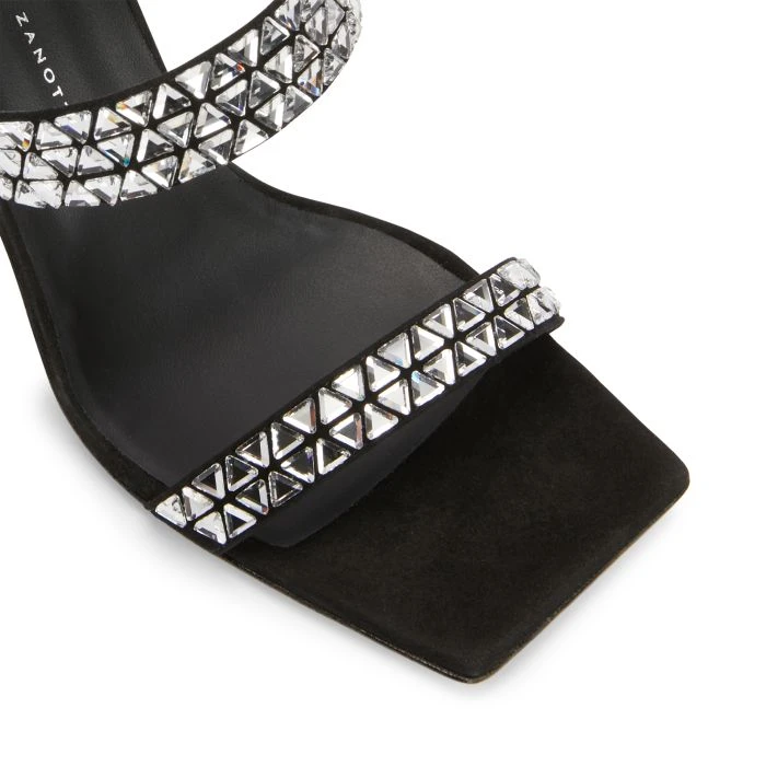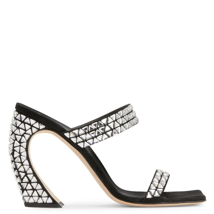 Black suede mules with crystal-coloured rhinestones all over, leather sole with logo and tone-on-tone covered heel. This shoe stands out thanks to its provocative, post-modern shape and style.