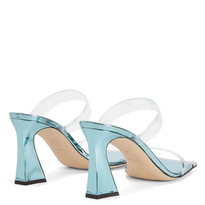 Mules crafted from light-blue, mirror-effect synthetic fabric with matching leather sole, featuring a square toe embellished with a silver metal accessory, clear PVC straps and matching spool heels.