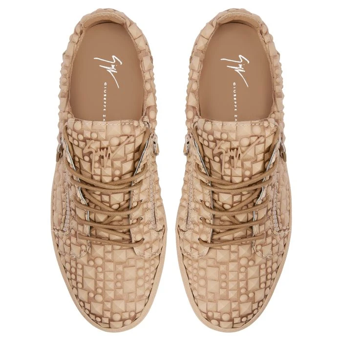 Low-top sneakers crafted from beige synthetic fabric and leather with matching cotton laces, featuring a beige rubberised ‘Signature’ detail on the tongue and matching plastic side zippers on the upper; an all-over application of 3D beige pyramids and a matching rubber sole give the design a perfect finish.