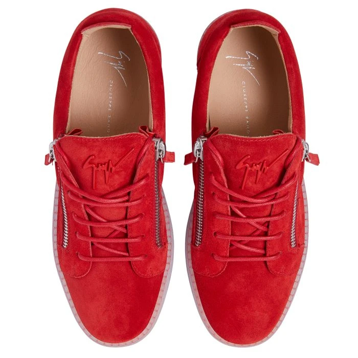 Low-top sneakers crafted from red velour with matching cotton laces, featuring a red rubberised ‘Signature’ detail on the tongue and silver side zippers fastenings on the upper; a transparent rubber sole gives the design a perfect finish.