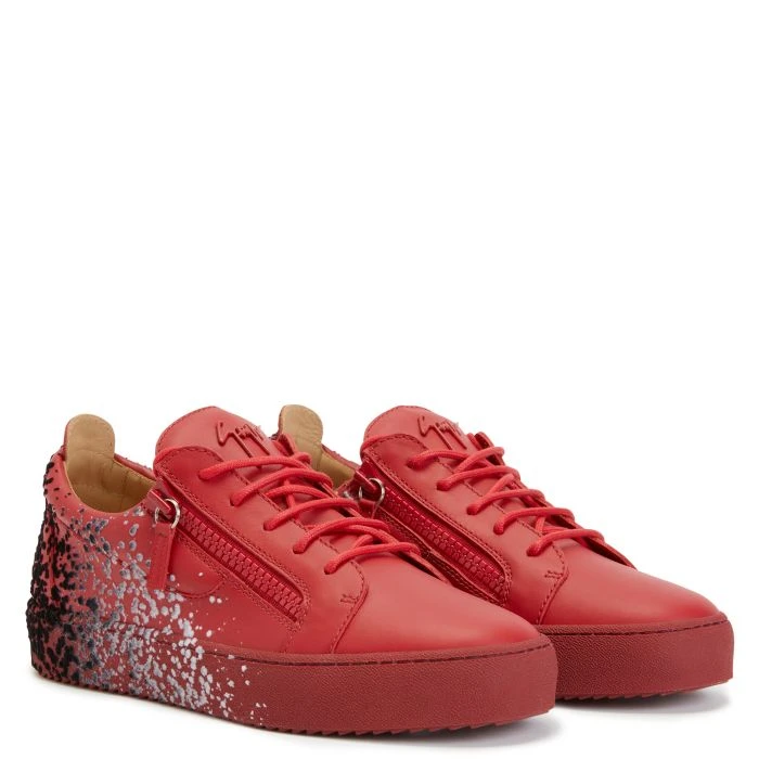 These red leather low-top sneakers boasts a minimalist upper that contrasts nicely with the black-and-white spray-effect flocking on the back, providing a touch of the bold, visually arresting street-art style. The red rubberised metal ‘Signature’ detail, the matching side zipper closures and the red rubber sole give the design a perfect finish.