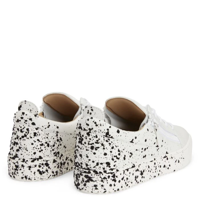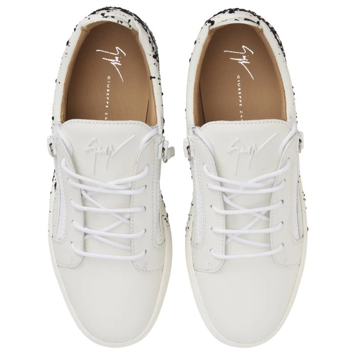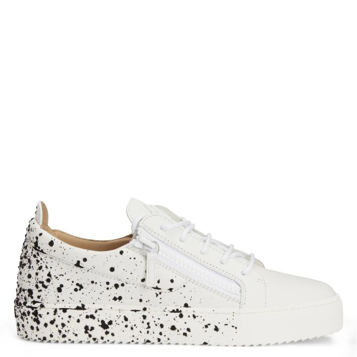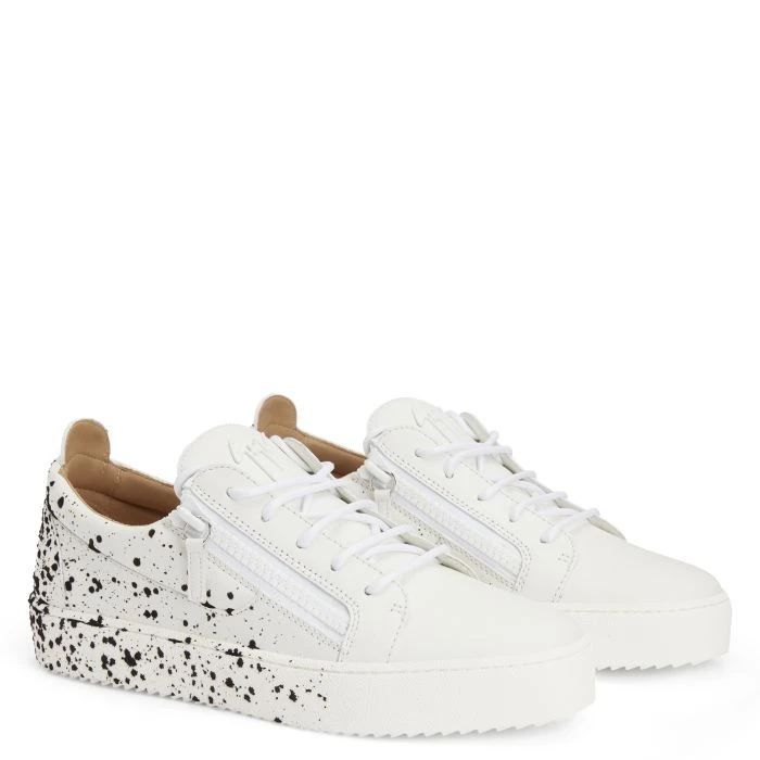 These white leather low-top sneakers boast a minimalist upper that contrasts nicely with the black spray-effect flocking on the back, providing a touch of the bold, visually arresting street-art style. The white rubberised metal ‘Signature’ detail, the matching side zippers and the white rubber soles give the design a perfect finish.