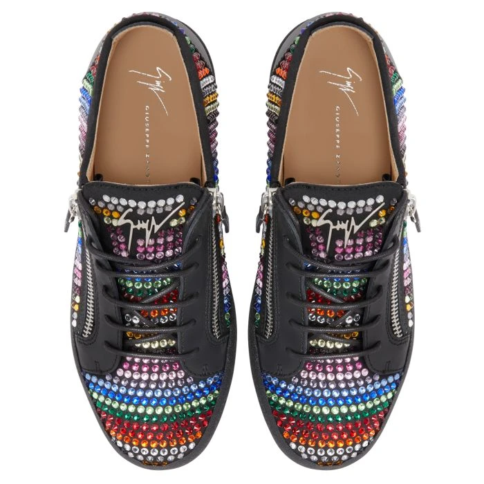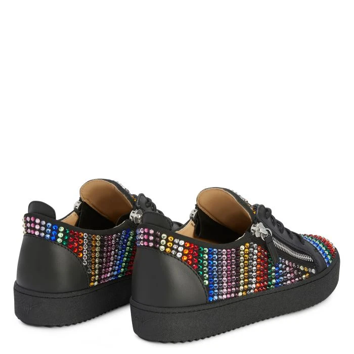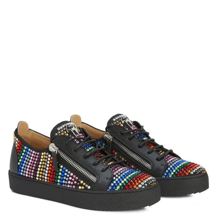 Low-top sneakers crafted from black synthetic fabric with suede effect and leather with matched cotton laces, featuring multicoloured rhinestone embroidery, a silver metal ‘Signature’ detail on the tongue and silver side zipper fastenings on the upper; a black rubber sole completes the design of this model.