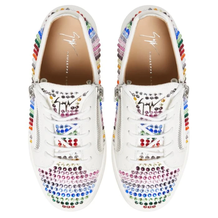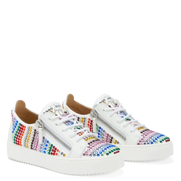 Low-top sneakers crafted from white synthetic fabric with suede effect and leather with matched cotton laces, featuring multicoloured rhinestone embroidery, a silver metal ‘Signature’ detail on the tongue and silver side zipper fastenings on the upper; a white rubber sole completes the design of this model.