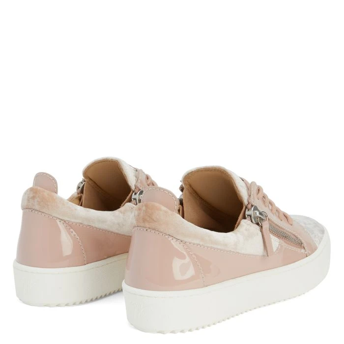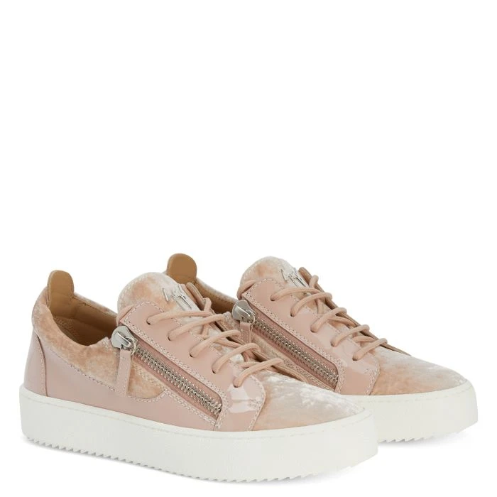 Low-top sneakers, crafted from powder pink synthetic velvet and pink patent leather, featuring tone-on-tone cotton laces, a silver metal ‘Signature’ detail on the tongue and silver side zipper fastenings on the upper; a white rubber sole gives the design a perfect finish.