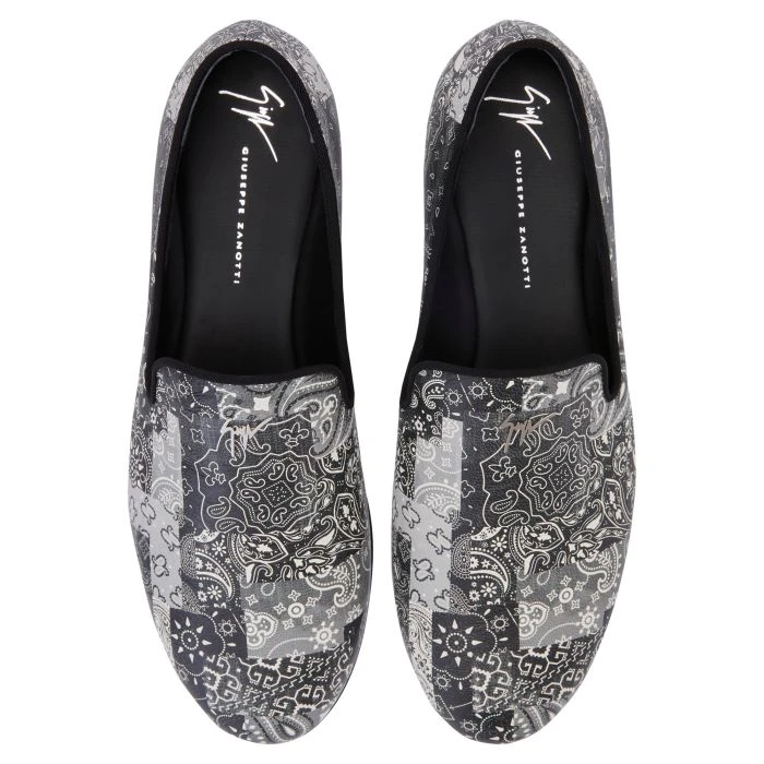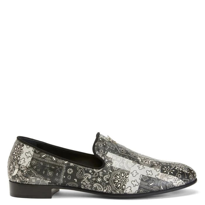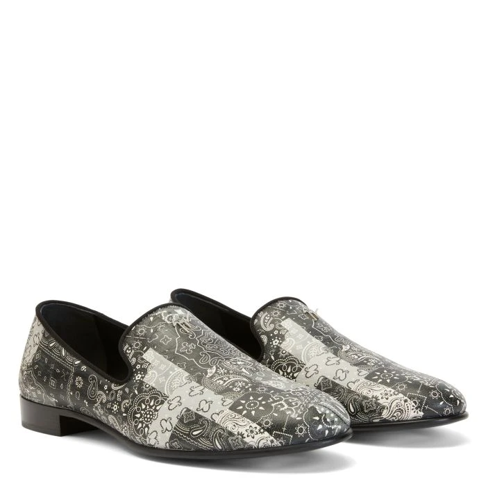 These black-and-white leather loafers with bandana print feature a silver metal ‘Signature’ detail and a leather inner lining and sole.